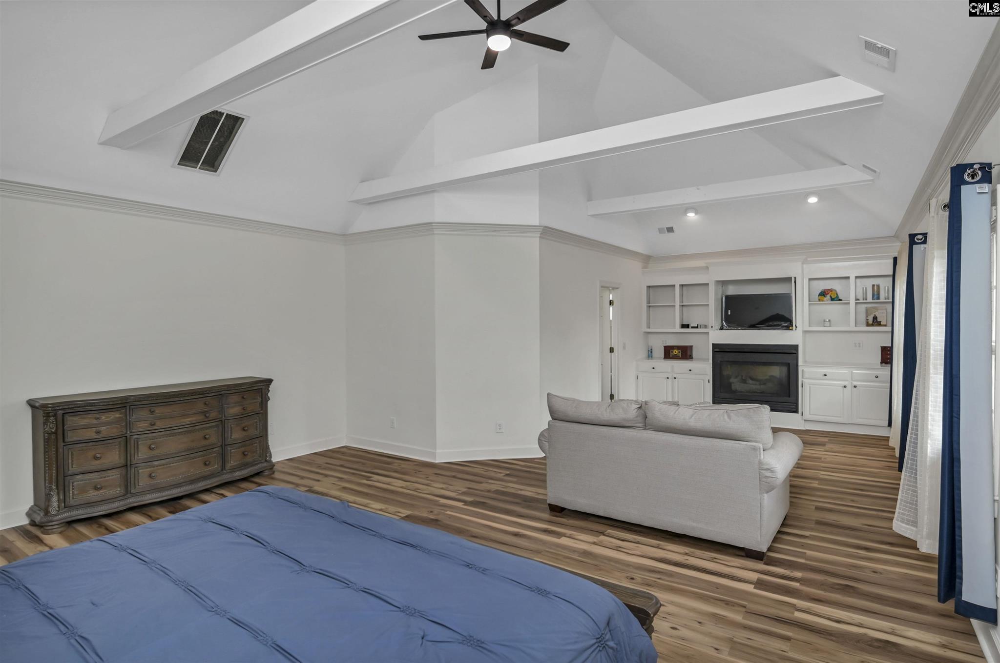 The living room features a wood-burning fireplace with the option to convert to gas, creating a warm and inviting focal point. The primary suite is a private retreat, showcasing cathedral ceilings, a gas fireplace, and an elegant, relaxing atmosphere.
